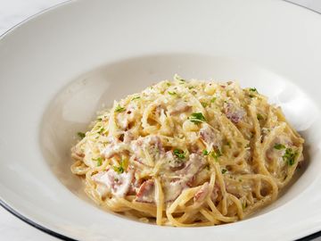 لحم عجل مقدد ممزوج بصلصة كاربونارا كريمية، ومُزين بجبنة