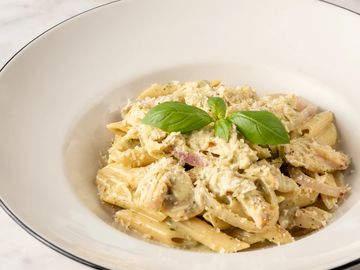 Bechamel, mushroom, onion, chicken & pesto sauce. Finish with Parmesan and basil.