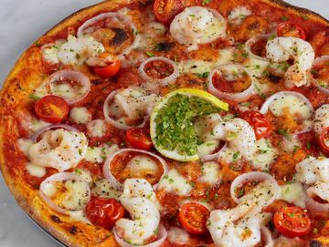 Arrabbiata sauce, prawns, onions, cherry tomato, mozzarella & garlic oil. Finished with parsley and lemon twist.