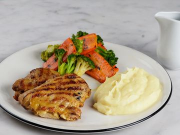 Lemon and herb marinated grilled chicken served with mashed potato seasonal vegetables and pepper jus.