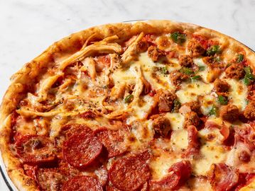 Chicken, pepperoni, spiced beef, veal bacon, tomato sauce and mozzarella.