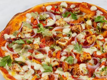 Tandoori chicken, mozzarella, tomato sauce, yellow peppers, green chillies and coriander.