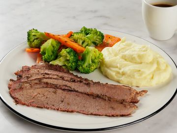 Slow cook beef served with mashed potato, seasonal vegetables and pepper jus.