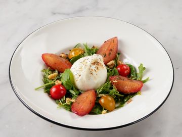 Burrata sitting on a bed of rocket & spinach mix, roasted plums & toasted walnuts. Finished with olive oil.