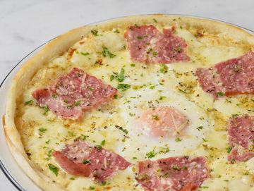صلصة كاربونارا كريمية، مغطاة بلحم العجل المقدد، وجبنة الموزاريلا، وبيضة دجاج. تُزين بالبارميزان والبقدونس.