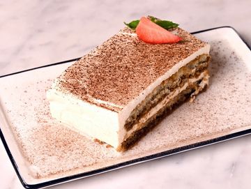Coffee soaked savoiardi biscuits layered with mascarpone topped with cocoa powder.