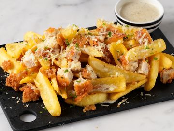 Potato dippers, cheesy truffle sauce, topped with chicken tenders and Parmesan.