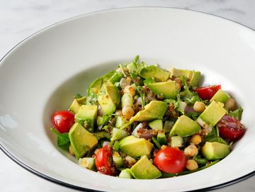 الاأفوكادو، الكينوا، الحمص، الخيار، الطماطم الكرزية، البصل، السبانخ والجرجير في صلصة الخردل والعسل