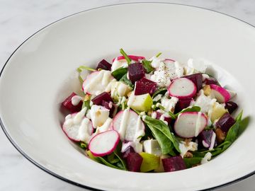 Baby spinach, feta cheese, beetroot, walnuts, red radish & green apple. Drizzled with yoghurt dressing and beetroot paste.