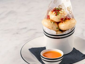 Our classic Dough Balls tossed with hot pineapple sauce then topped with crispy bacon and parmesan.
